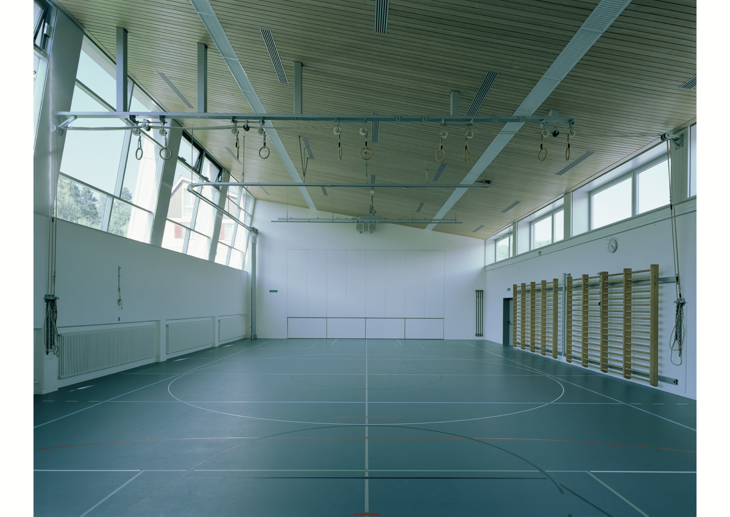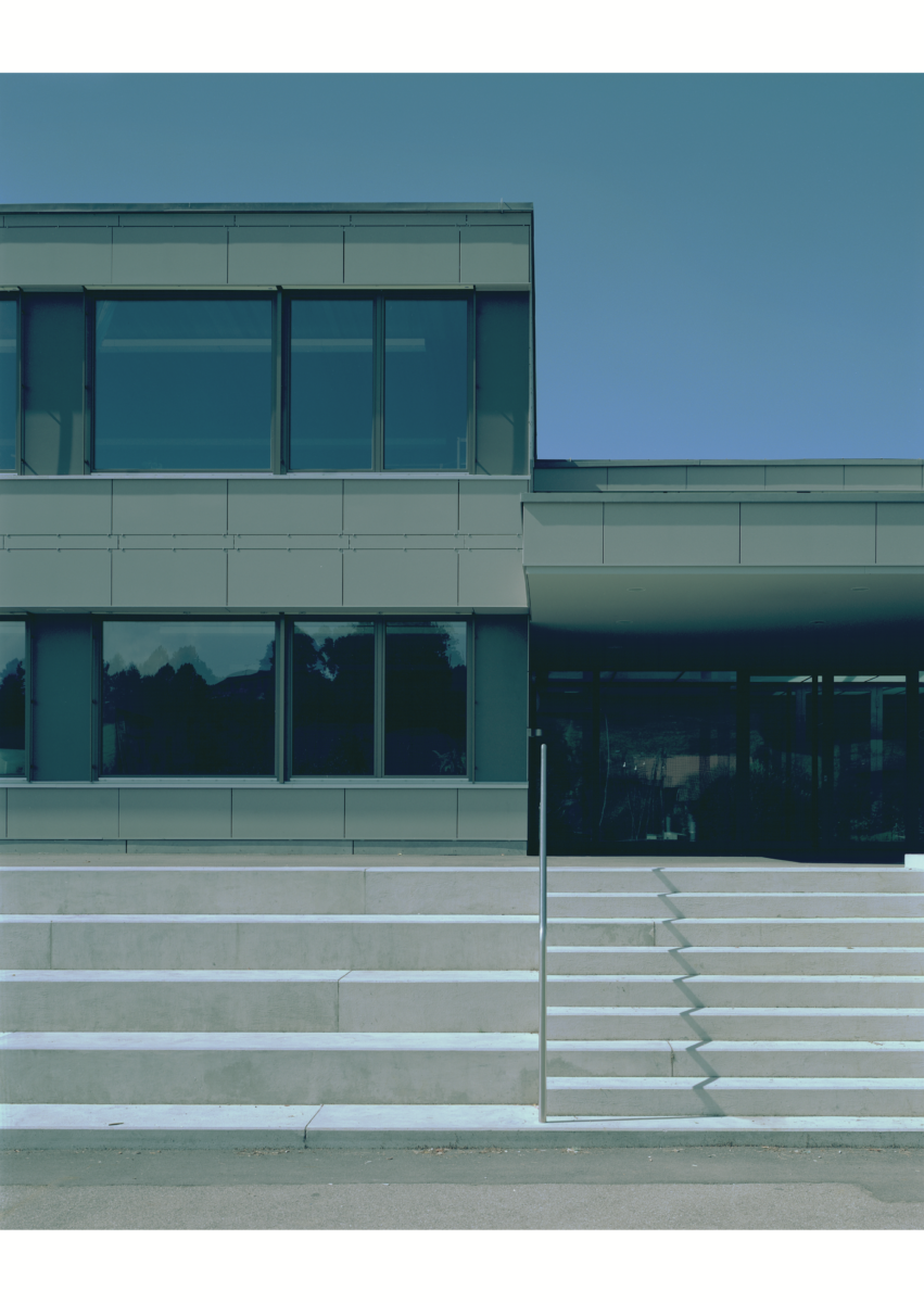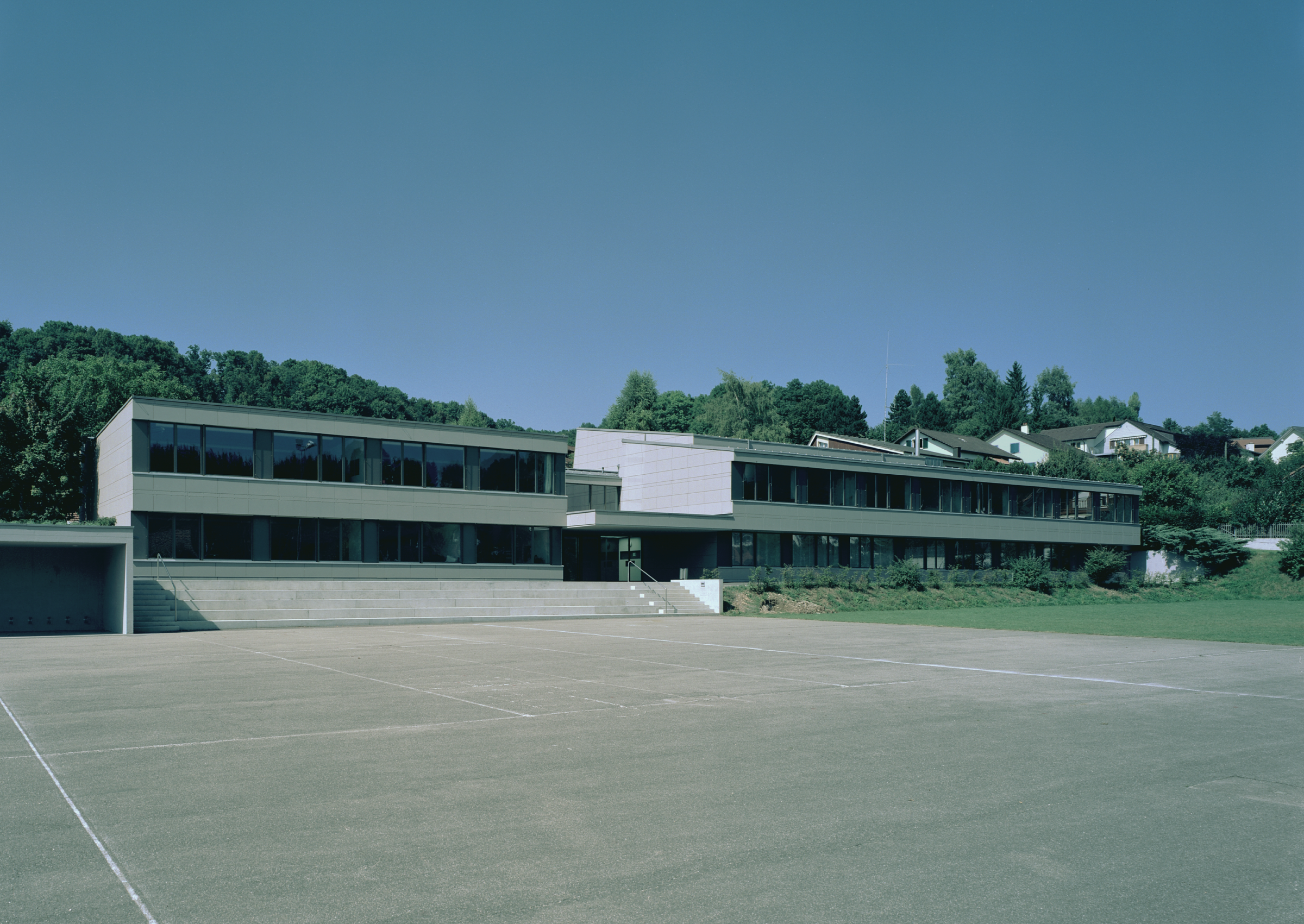 Für das aus alterungsbedingten, baulichen und energietechnischen Gründen erneuerungsbedürftige Schulhaus wurde ein integrales Sanierungskonzept entwickelt. Mit der Anwendung einer flächigen Verkleidung aus Steinzeugplatten über der Wärmedämmung sind die alten und die neuen Volumen hinter eine monochrome, dünnhäutige Abwicklung gelegt. Die Erweiterungsbauten und das existierende Schulgebäude bilden einen analogen Ausdruck und schaffen in dieser Form der äusseren Verschleifung eine zusammengeführte, einheitliche Gesamtfigur.