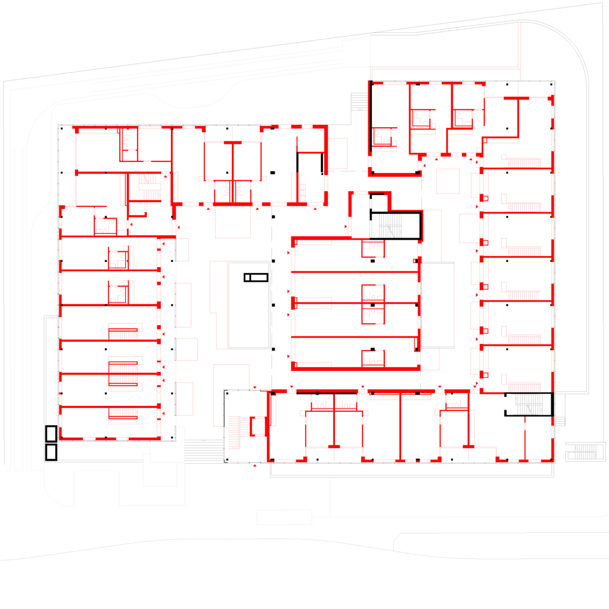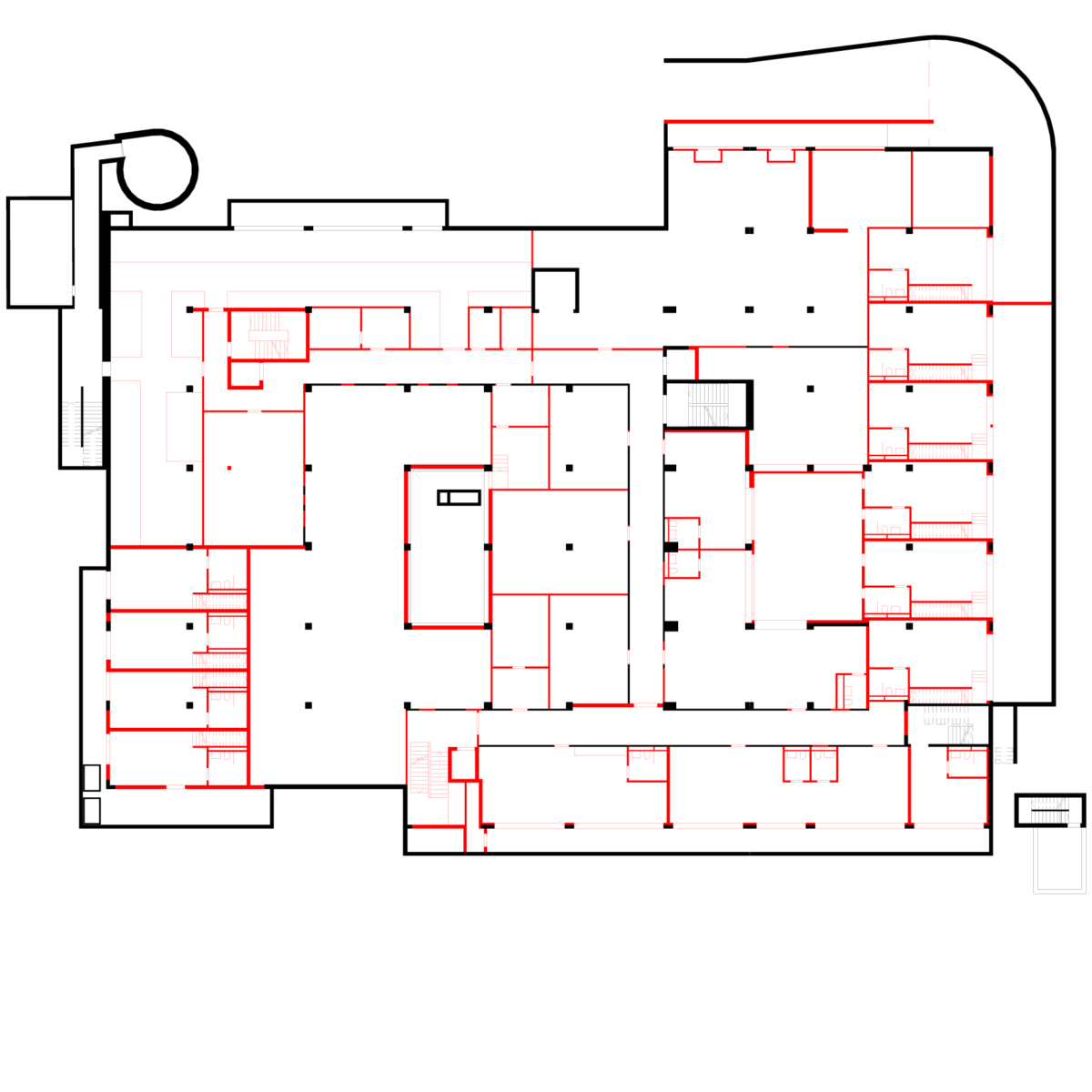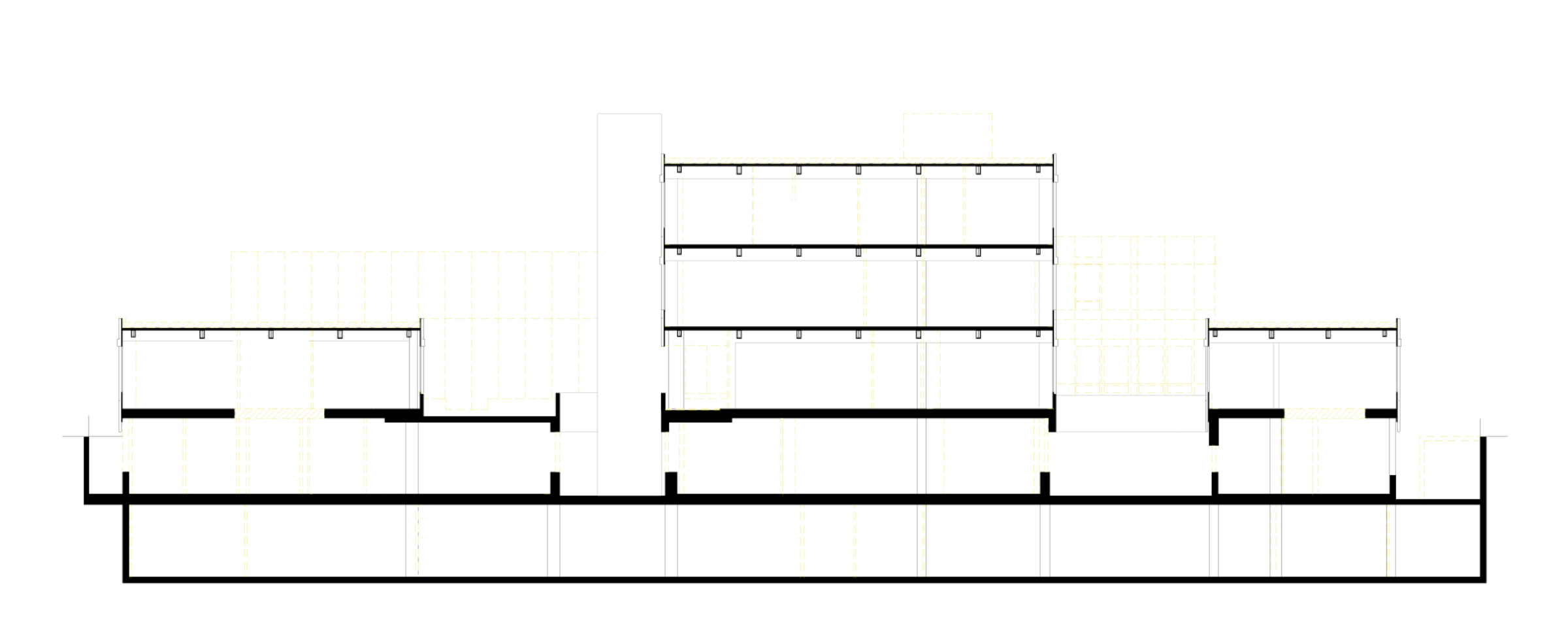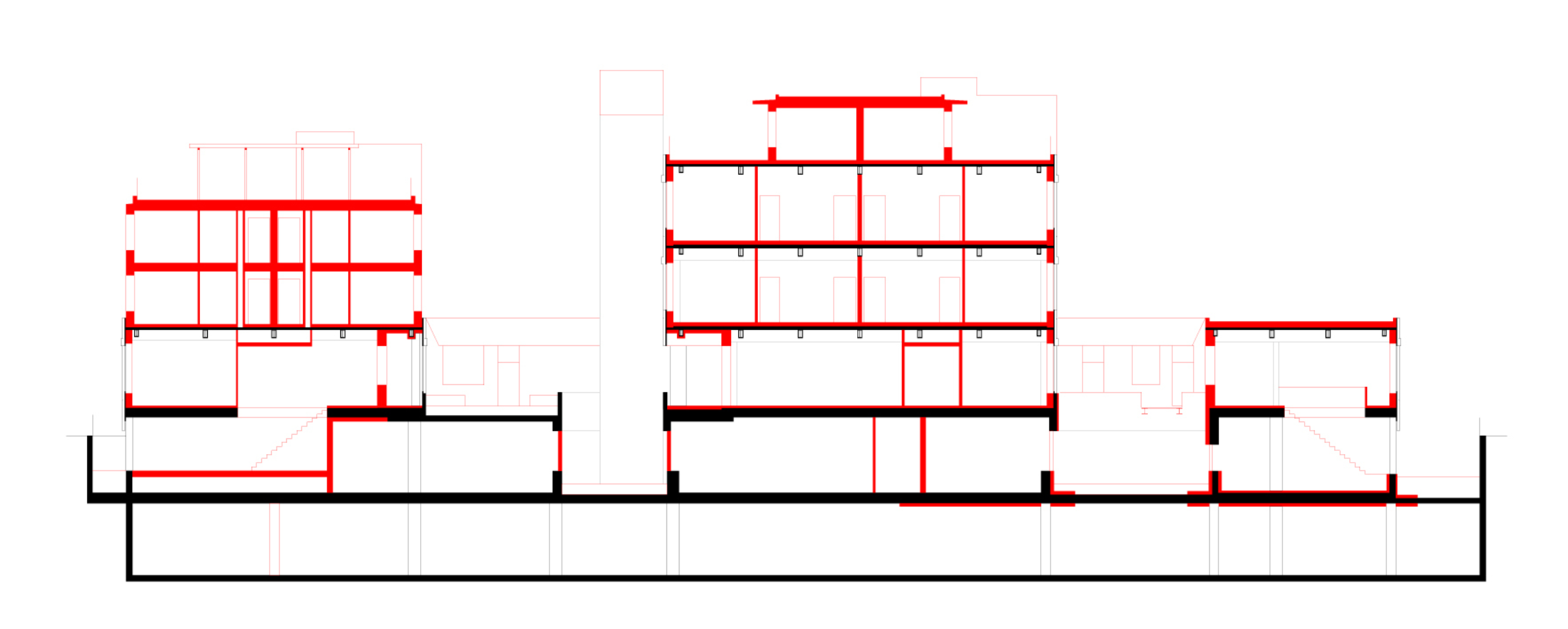 Das bestehende Gebäude besteht aus zwei Untergeschossen aus Stahlbeton und ein- bzw. dreigeschossigen Aufbauten, die als Stahlskelettbauten ausgeführt sind. Die ergänzenden Aufstockungen werden in Holzelementbauweise ausgeführt.