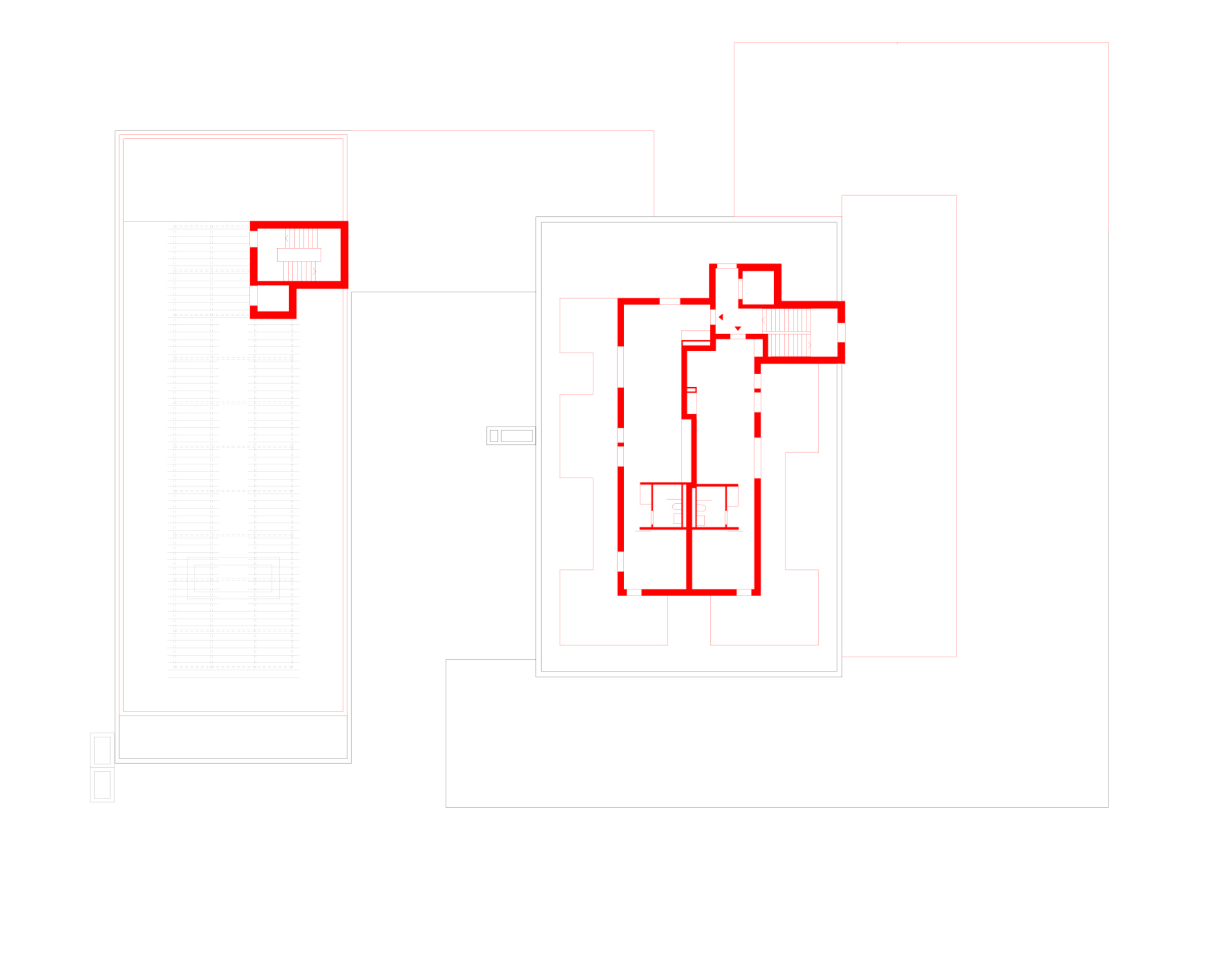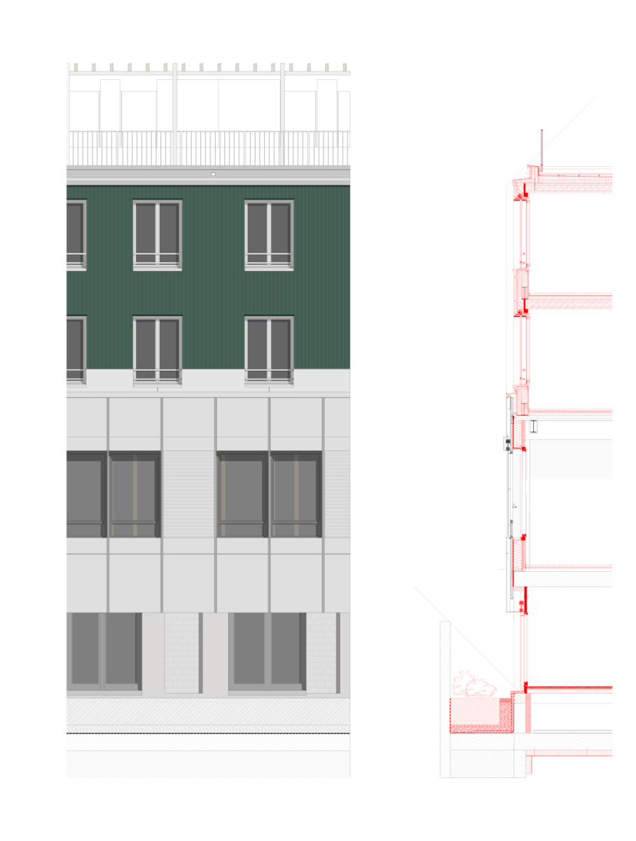 Der Ausdruck des Gebäudes wird von den beiden Zeitspuren geprägt sein, die sich überlagern und ergänzen. Die bestehende Fassade ist aus präzisen Aluminiumpaneelen zu einer dünnen Haut zusammengefügt. Die neuen Bauteile sind mit einer Holzschalung verkleidet, welche die Erscheinung der Aufstockungen und der ergänzten Fassaden im EG prägt.